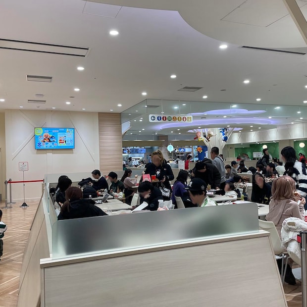 お昼時間だったので、フードエリアは大混雑でした💦席が空いたらスタッフの方が案内してくれる流れになっていました👀向かいにあるレストランは、整理券制になっていましたが、3時間以上かかるとの事だったので断念し、フードコートの列に並ぶことに👀