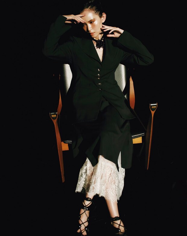 加藤かすみ(以下K)ブラックのスーツというミニマルなスタイルは今季のトレンド。ブラックのニュートラルなセットアップだから、生命力を感じるようなウォームカラーを合わせたところが、すごく美香子さんらしくて素敵だなと思いました。