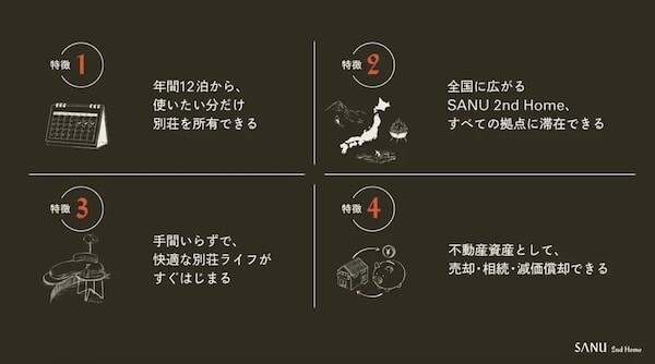 また、「SANU 2nd Home Co-Owners」とは、「資産としての別荘」ではなく、「暮らしの拠点」として自然の中に家を持つ、新しい所有の形を提案するプロジェクト。必要な分だけ購入し、全国の拠点を相互に使える、共同オーナー型のセカンドホームサービスだ。