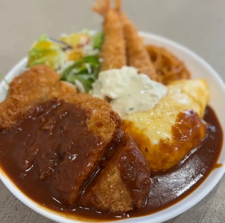 人気の「大人のお子さまランチ」1,500円は、オムライス、とんかつ、エビフライ、サラダが一皿に盛り込まれており、提供時、注文した人から「うわー」と声が上がるという。