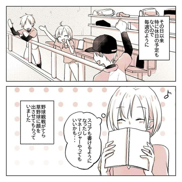 りんさんは、初めて草野球を見学したその翌週から毎回試合に顔を出すようになりました。スコアも書けるようになり、マネージャーをやる気持ちも湧いてきます。しかしある日の仕事の休憩中、別の先輩からゆーさんの彼女の話を聞かされ…。