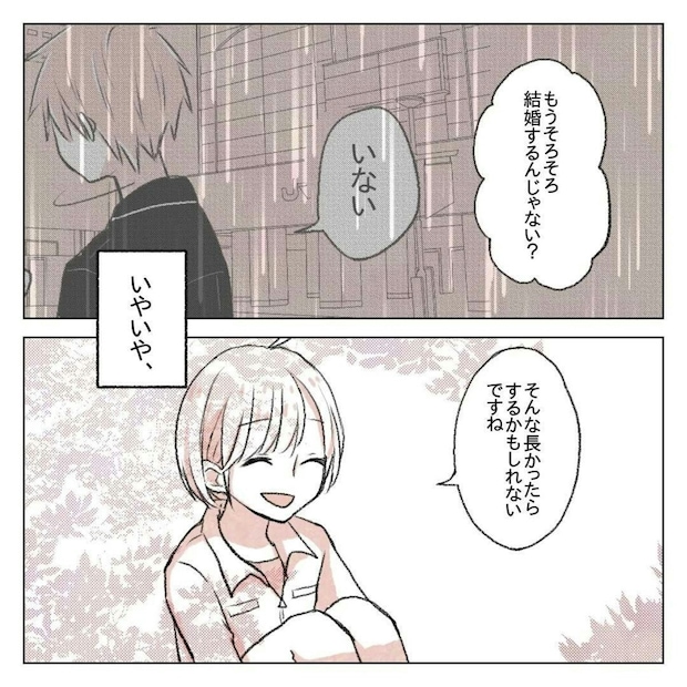 後に恋人同士となる2人のなれ初めが描かれた作品の中には、りんさんの気持ちの変化が丁寧に描かれています。苦手な先輩という線引きをしていたゆーさんの優しい一面に触れる度に、りんさんの笑顔が増えていきます。そして、元カレとのことで心が沈んだとき、「一緒に笑いたい」と思ったのはゆーさん。りんさんは、気づけばそばにいてくれるゆーさんの存在が、自分にとって落ち着く相手だと感じるようになるのです。