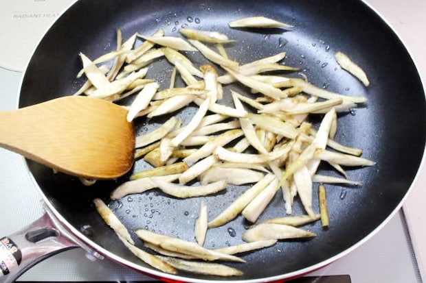 ごぼうは硬いので先に油で2分ほど炒めました。炒めることで香りも立ちます。