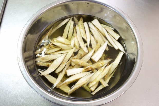 ごぼうのアクを抜くため水に5分ほど晒しました。