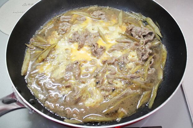 口径の広いフライパンを使えばごぼうを炒めやすく、そのまま煮汁を加えて牛肉と卵に火を通すことができるので、フライパンひとつで完成するのも魅力的でした。