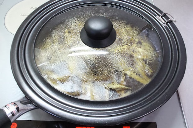 フタをして弱火で5分ほど煮て味見してみると、ごぼうがやや硬かったので追加で1分30秒ほど煮てやわらかくしました。