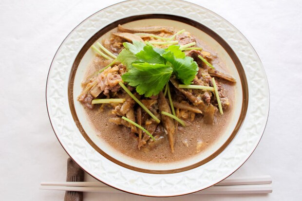 料理研究家・上田淳子さん考案の「ゴボウと牛こま肉の柳川風」がこちらです。最後に溶き卵を半熟状に加熱しましたが、茶色い煮汁を吸って、卵がくすんだ色になってしまい、全体が茶色っぽい地味な仕上がりに。ですが、生の三つ葉を添えると、グッとおいしそうになりました。