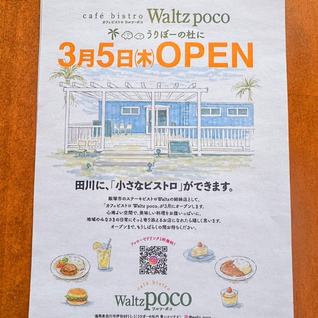 そんなWaltzの姉妹店「Waltz pocoワルツ ポコ」が3月5日(木)にオープンするそうです。場所は田川市のうりぼーの杜もり。
