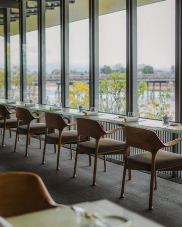 「MUNI KYOTO」の1階、豊かな水を讃える桂川と嵐山の象徴・渡月橋を望む川辺に佇む「Riverside Café MUNI」は、朝食からランチ、アフタヌーンティー、ライトディナーまで、一日を通して多彩なシーンに寄り添うオールデイダイニング。床から天井まで広がる大きな窓から自然光が差し込む、開放的なプライベート空間を備えている。