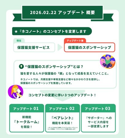 「ネコノート」は、今回のコンセプト変更に伴い、支援者と保護猫のつながりをより強固にするための3つの大型アップデートを実施する。