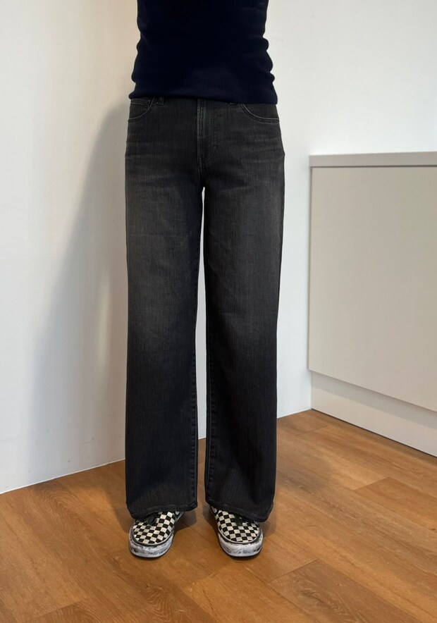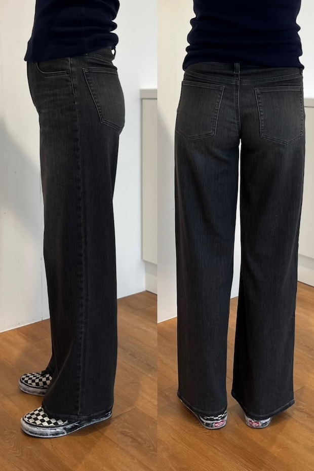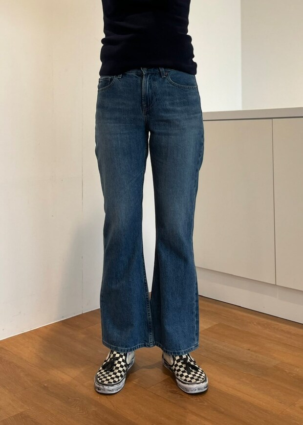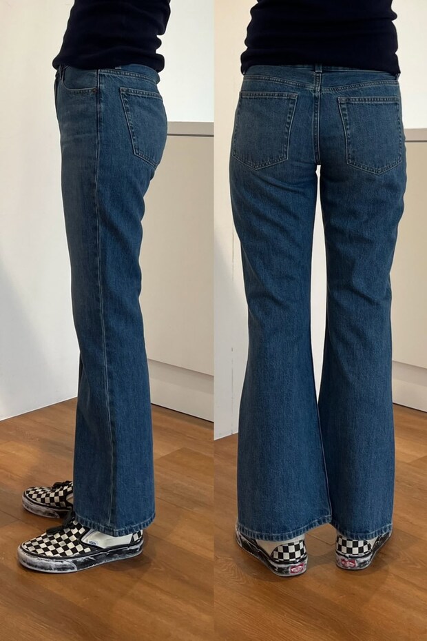 まず、気に入ったのは丈感です。筆者の体型の場合、丈が長めのブーツカットは古臭く見えると思っているので、これは理想的。ちなみに高身長の筆者は標準丈を試着したのですが、丈短め・丈長めも展開もあります。ブーツカット具合も絶妙で、脚のラインもキレイに見えますよね。あ、こちらのモデル、ローライズになっています。最近は股上深めが安心する世代なので、抵抗あるかな? と思ったんですが、ほどよいローライズ感なのですんなり受け入れられました。