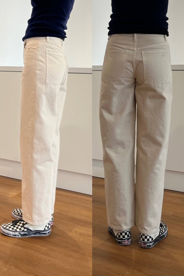 ワイドパンツは大好きなのに、なぜかバギーデニムは苦手な筆者。その理由は、デニムはしっかりとした生地感なので太って見えそうだから。【ユニクロ アンド ジェイダブリュー アンダーソン】の「バギージーンズ」もコットン100%の13オンスなので同じだろうと思っていたら、試着してびっくり。裾に向かってテーパードしたコンパクトなバギーシルエットだったんです。これならしっかりとしたデニム生地でもすっきりはきこなせるし、なんなら脚もキレイに見える。トレンドに左右されることもないので、長く愛用できることうけあいです!