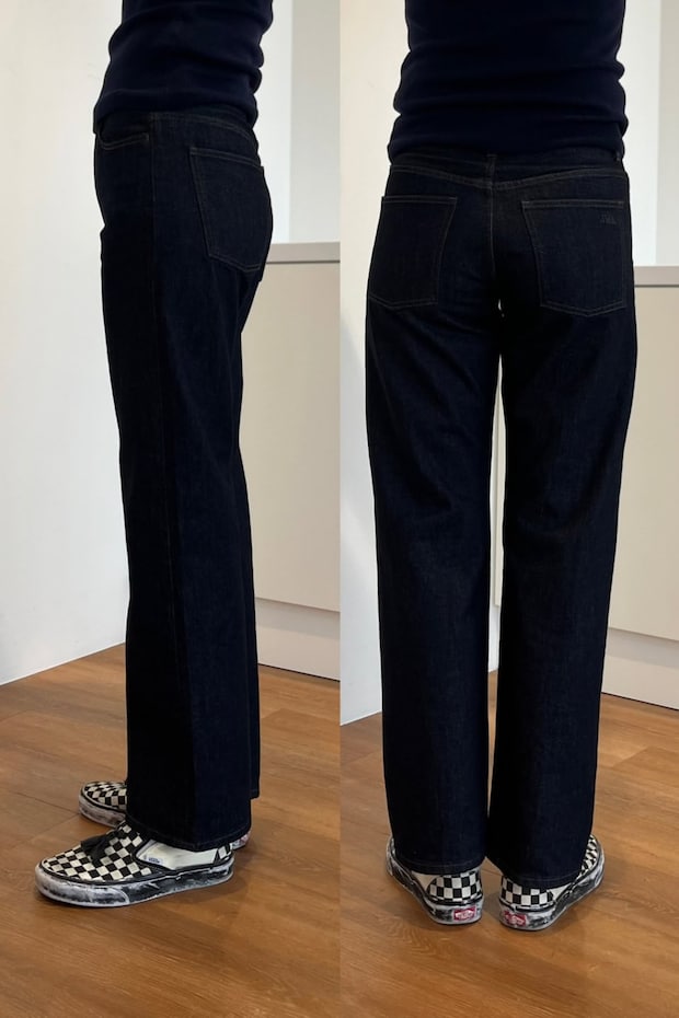 デニムってストレートシルエットが一番難しいと常々思っているのですが、【ユニクロ アンド ジェイダブリュー アンダーソン】を試着して感動! これ、めちゃくちゃシルエットがキレイじゃないですか? ネイビーを選んでいるから締まって見えるのもあるかもですが、カラダのラインも拾いすぎないので、年齢を重ねると共に気になっている腰まわりのお肉もうまく隠せてる気がします。