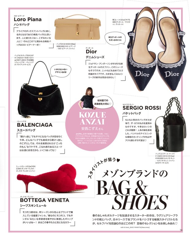 もちろんオトナミューズですから、春夏のハイブランドの新作チェックも怠らず。スタイリストの皆さまのリアルに欲しいものリストを教えていただいてきました。これ、お買い物大魔神でもあるスタイリストの皆様が、この雑誌が発売されるころにはすでに買って持っていたりするのを、SNSや実際にお会いしたときに確認するのもマニアックな楽しみかたのひとつです。買うよね、と。雑誌載せただけじゃなくて、本当に買うんだね、と。