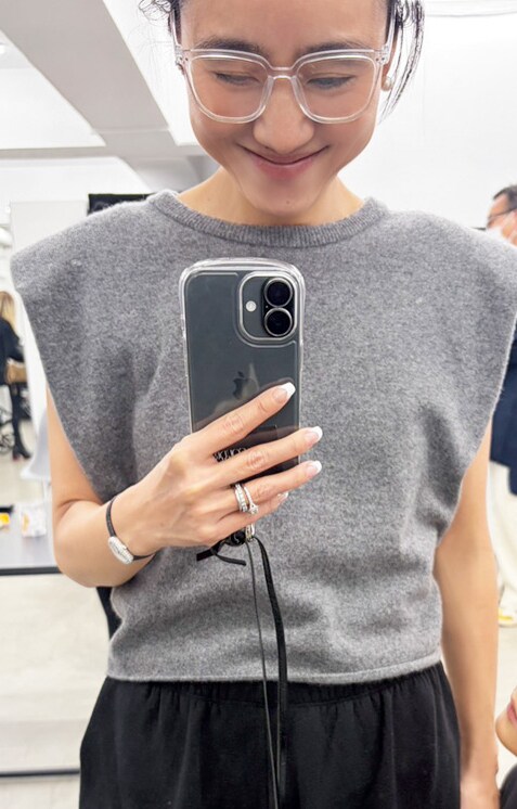 金子さんが試着しているのはスタイリスト安西こずえさんの『COZ manufacturedby WRAPINKNOT』の肩パッド入りニット。展示会会場でも爆売れしていました。