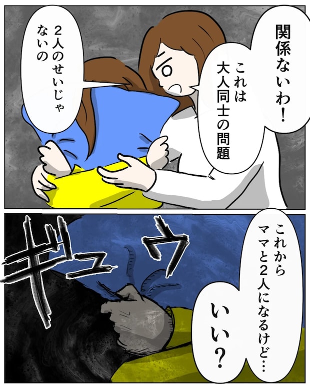 5年前に元夫と死別した由以子さんは、バツイチで同じく子どもを持つ達夫さんと出会い再婚。ある日、突然くれあちゃんと同じ中学校に行きたいと言い出した愛花ちゃんを、由以子さんは応援することに。くれあちゃんは自分の部屋に引きこもるようにそんなある日、由以子さんと愛花ちゃんが一緒に帰宅すると、荒れた部屋で頭を抱えてうずくまるくれあちゃんと仁王立ちする達夫さんの姿が。精神的にも参ってしまった2人を見て、由以子さんが励まそうとするも、「くれあは俺の娘だ。お前に口を出される筋合いはない!」というまさかの発言が。くれあちゃんを思う気持ちは一緒のはずなのに夫婦として歩み寄れず、由以子さんは限界を感じていました。翌朝、愛花ちゃんの想いも否定する達夫さんとのことをそのままにはできない!と話し合い、結果離婚することに。愛花ちゃんに離婚を伝えると「私のせいだよね」と呟きました。