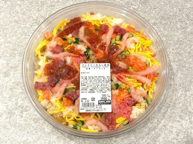 コストコのお寿司コーナーには「海鮮漬けちらし」が置かれていますが、ひな祭りのシーズンになると、毎年このファミリーちらし寿司が登場します。豪華な海鮮食材を使用したちらし寿司で、価格は2,998円(税込)です。