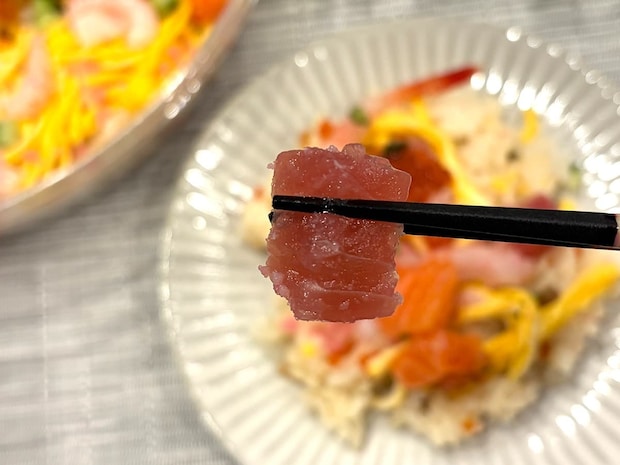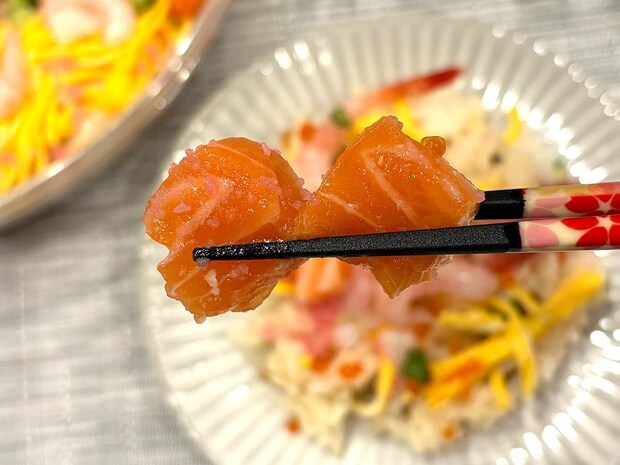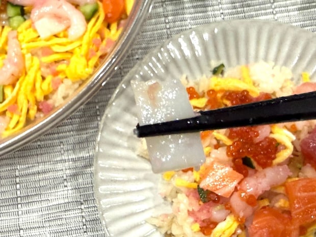 パッと見ではわかりにくいですが、小さないかも散りばめられています!いか特有の弾力もしっかり感じられ、ちらし寿司に旨味と食感のアクセントを加えてくれますよ!