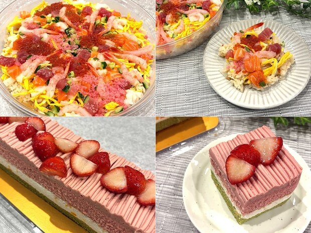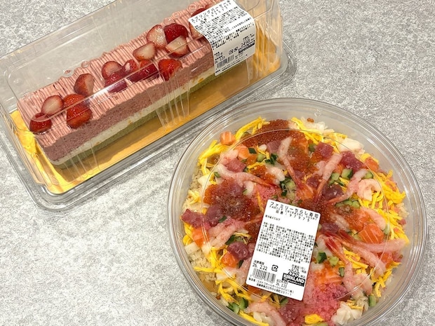 コストコで売られていた、ひな祭り仕様のファミリーちらし寿司とスプリングバーケーキ。