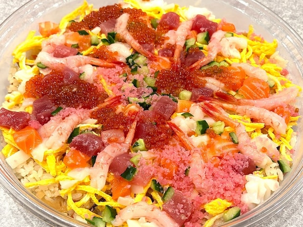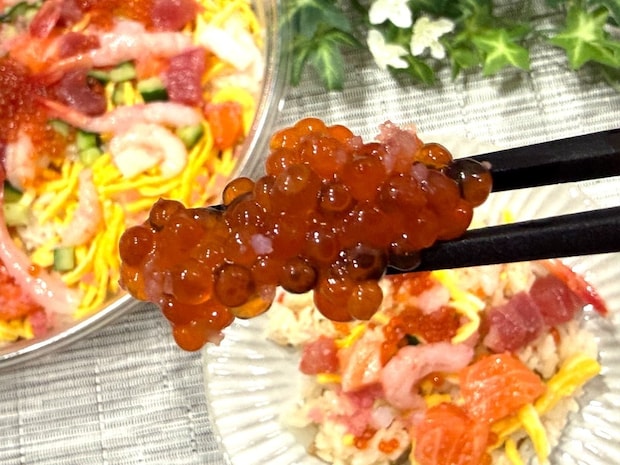 中にはちらし寿司の具材として一般的な錦糸卵、かんぴょう、レンコン、きゅうり、桜でんぶなどをはじめ、いくら、甘エビ、サーモン、マグロ、いかなど豪華な海鮮もトッピング!