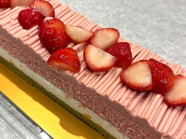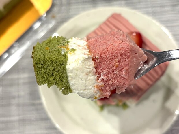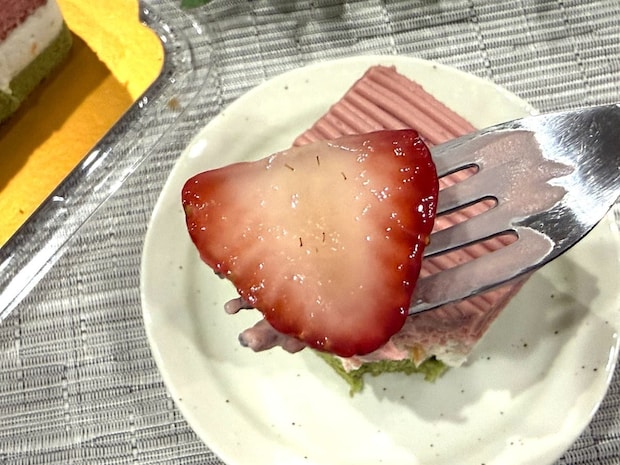一番下の緑色のスポンジケーキは比較的あっさりとした味わい。いちごとホイップクリームの層は甘めですが、緑色のスポンジケーキが加わることで全体の甘さがうまくまとまっています