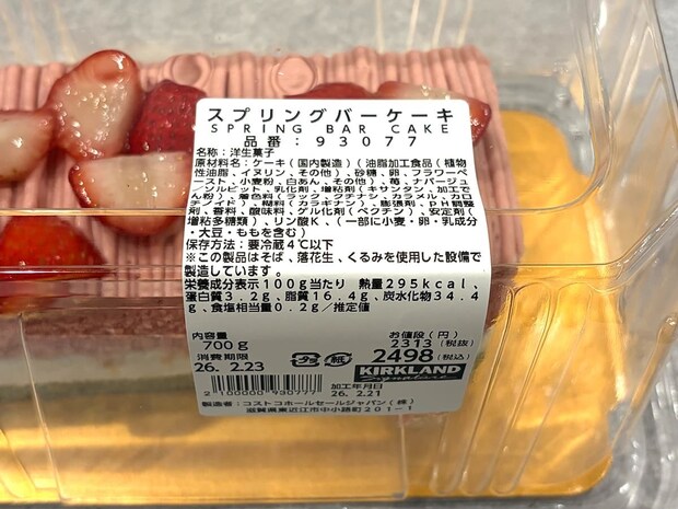 菱餅のように桃色、白色、緑色が層になっている華やかなケーキ。コストコのスイーツではお馴染みの横長のパッケージに700gのケーキが入って、価格は2,498円(税込)です。