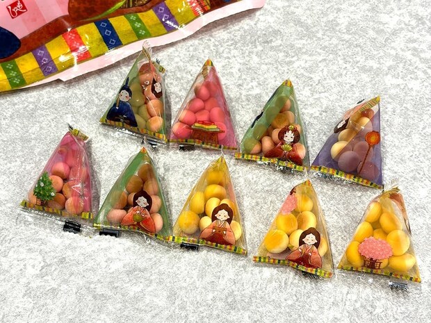 大袋の中には、お内裏様・お雛様・三人官女・ぼんぼり・菱餅・橘・桜の花のイラストが描かれている個包装の袋が入っています。