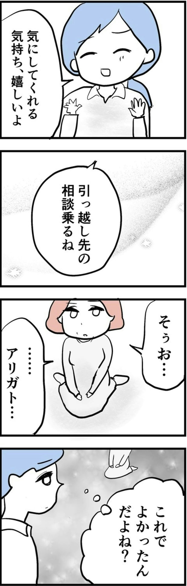 友人のさみしそうな表情は気になりますが、自分と娘を守ることの方が大切です。近所への引っ越しを阻止することができ、よかったと感じました。