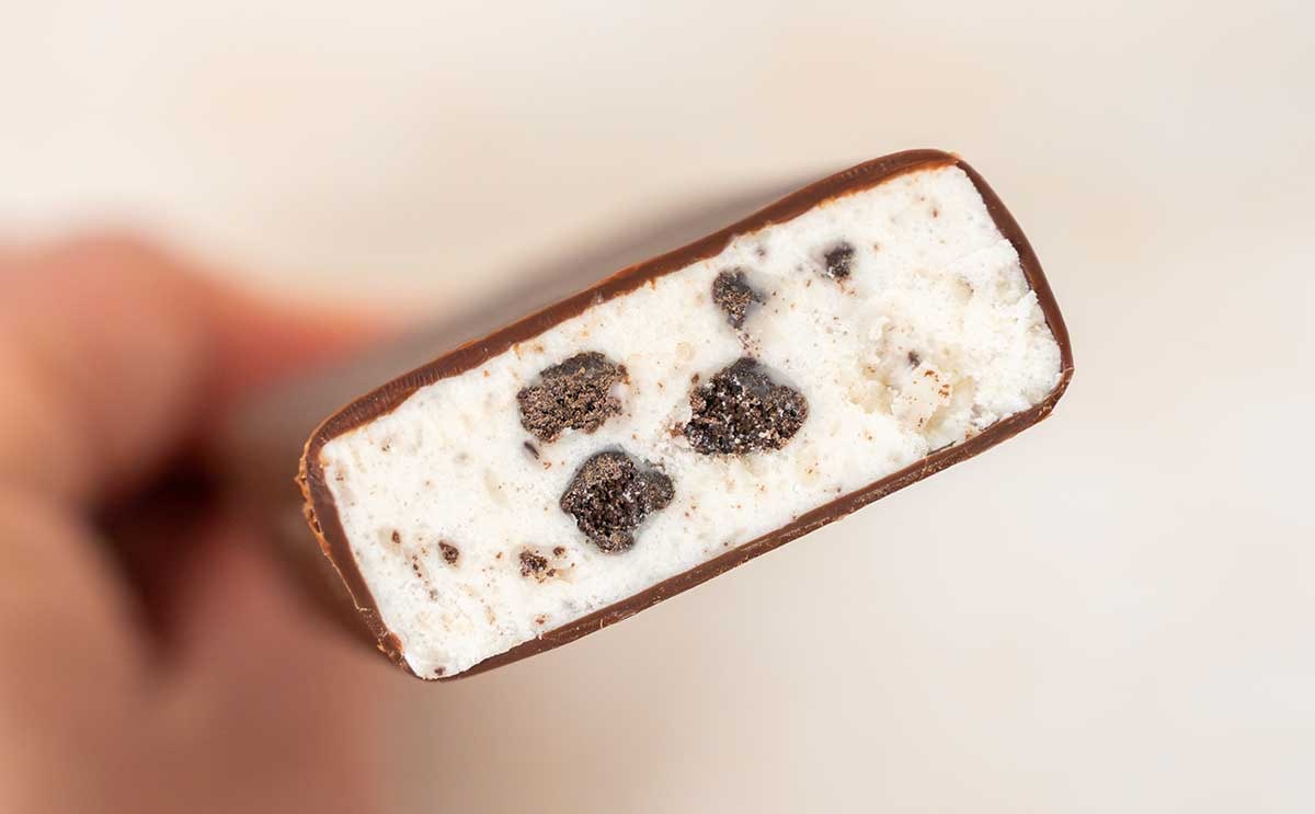 表面のチョコレートはくちどけがよく、中のバニラアイスはすっきりとしつつもコクがあります。そんなアイスにごろっとしたサイズ感のクッキーが混ざっているので、サクサクとした軽やかな食感と風味豊かなココアの味わいが堪能できます。