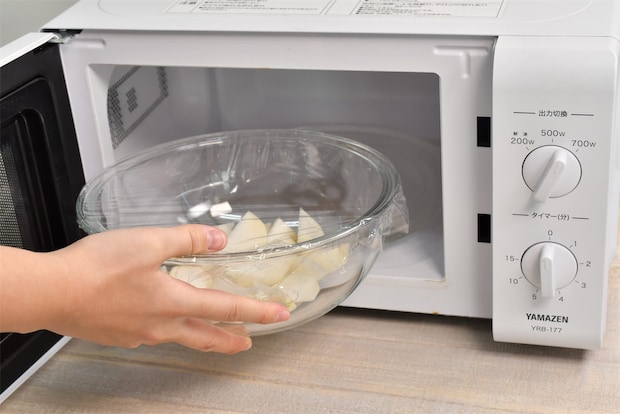 2. 耐熱容器にかぶを入れて、電子レンジ(600W)で3分加熱する。