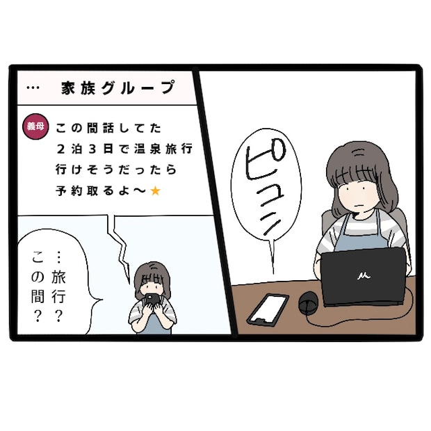 ある日、義理の両親と私たち夫婦で作っているチャットアプリに、義母から2泊3日の温泉旅行の予約を取るというメッセージが入りました。何の話?『この間話してた』とあるけれど、何も知らされていなかった私はきょとんとなりました。