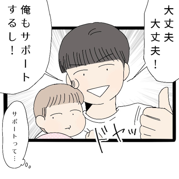 するとコウタは「大丈夫大丈夫!」と自信たっぷりに言って「俺もサポートするし!」と満面の笑み。でも産後の私とアオが家に帰って来てから、コウタがどれだけ育児を自分事として捉えているのかを振り返ると・・・。サポートという言葉ににじみ出ているように、あくまでも私の手伝いくらいはするという雰囲気のコウタを見て、旅行中のアオのお世話に不安しかありませんでした。