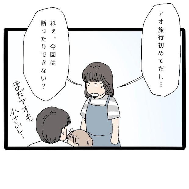 生後まだ半年で、長時間の遠出すらしたことのないアオのことを考えると、2泊3日も旅行に行くなんて荷が重すぎて心配になりました。なるべく角が立たないように言い方を考えつつ「アオは旅行が初めてだし、今回は断ったりできない?」とコウタにお願いしました。旅行へ行くのなら、せめて近場で日帰りにするか、もう少し外出に慣れさせてからにしたいなと思いました。
