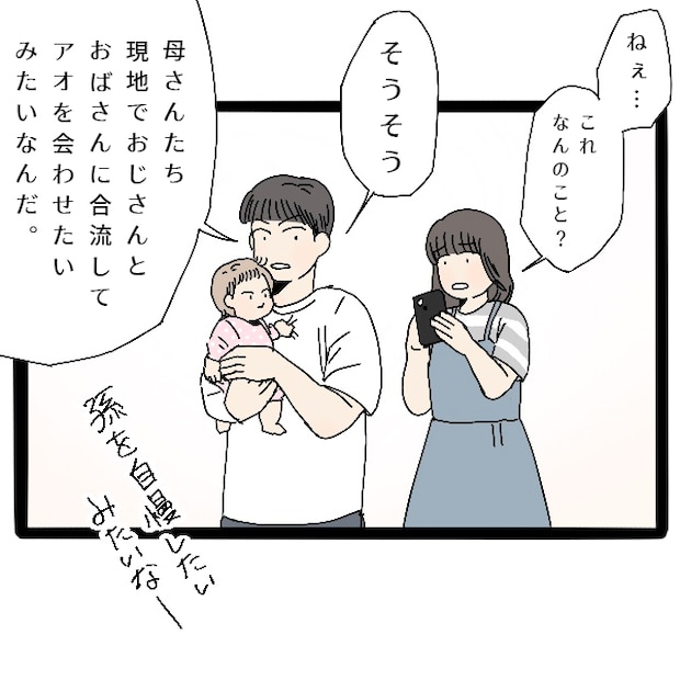 さっそくコウタに聞いてみると、当然のように「そうそう」とうなずいたコウタから、温泉旅行に行って、現地でさらにおじさん、おばさんとも合流したがっているという話をこの時初めて聞きました。義母が親戚にもアオを会わせたいと言っているようなのです。そんな話、私は何ひとつ聞いていません。
