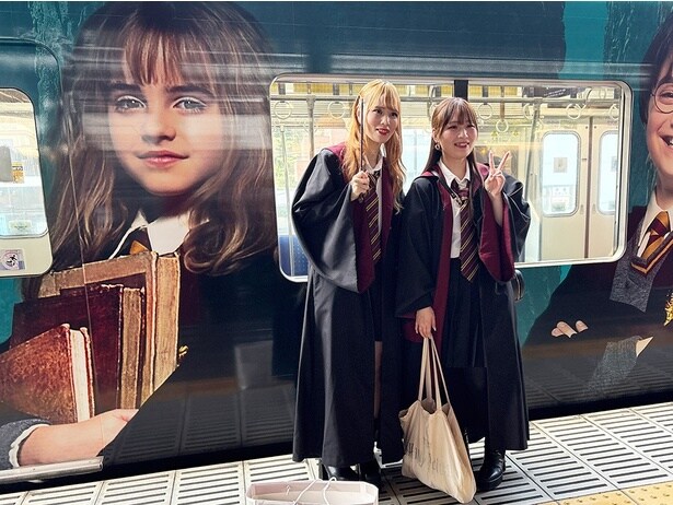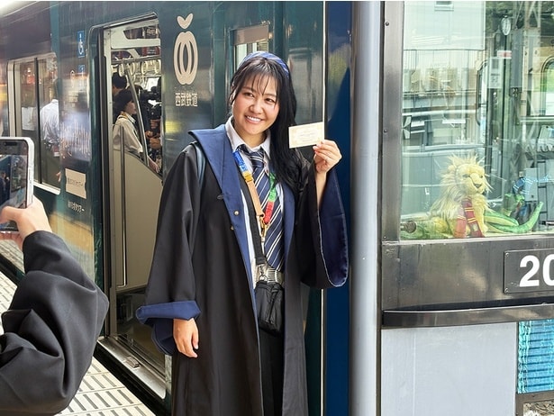 池袋駅から豊島園駅まで約17分、ファンたちは魔法学校へ向かう車内を、ホグワーツ生気分で思い思いに満喫。車内アナウンスもホグワーツ特急仕様に。この日だけの特別な体験となった。