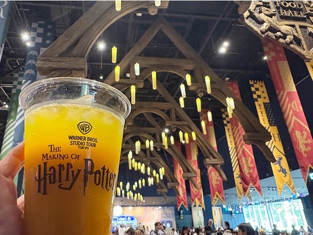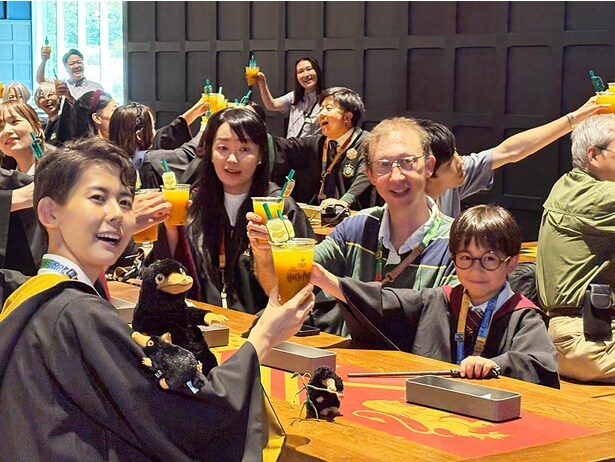 続いて、“ホグワーツの大広間”をイメージしたフードホールへ。まずは、「パンプキンジュース」を片手に、みんなで「乾杯!」。作中でもおなじみの飲み物を、実際に味わえるのが魅力だ。