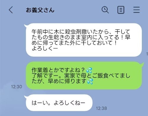 義父からのLINEに、「イラついた」という投稿者さん。義両親と同居しているという投稿者さんは、朝、外へ洗濯物を干してから、実家へと行ったそうです。実母とお昼ご飯を食べるつもりでいたそうですが、義父から「早めに帰って」との指示が…。同居ゆえの苦労を実感させられる投稿に、共感する方もいらっしゃるのではないでしょうか。義両親との同居問題についての投稿を紹介します。