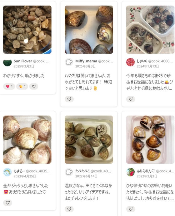 つくれぽ(つくりましたフォトレポートのこと) にも、「わかりやすくて大助かり」「本当に砂がすぐ出ました」など、レシピを試した人から喜びのコメントが。