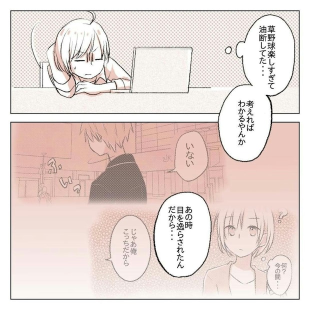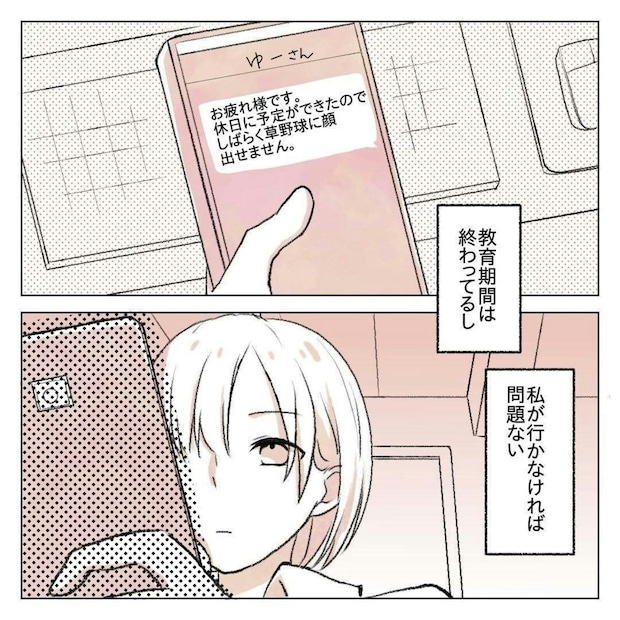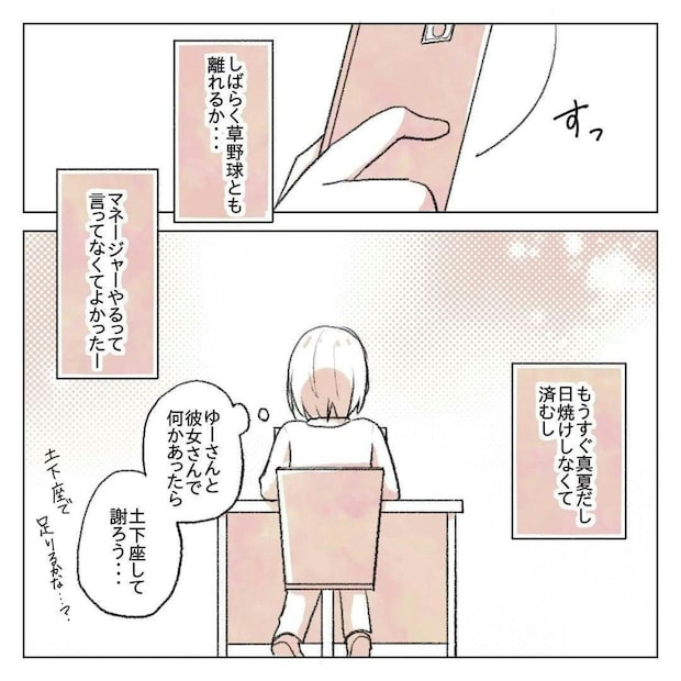 りんさんはゆーさんに彼女がいると聞かされ、どうにも気持ちが落ち着きません。彼女持ちの先輩と草野球で会うのも気が引けるので、「予定があるから顔を出さない」とゆーさんに連絡を入れることにしました。
