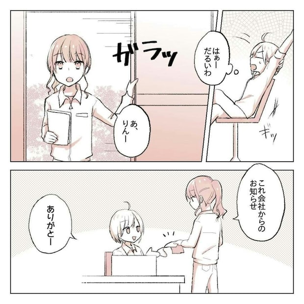 りんさんは、ゆーさんに「しばらく顔を出さない」と連絡を入れました。そこへ、りんさんの同期が会社のお知らせの紙を持ってやって来ました。
