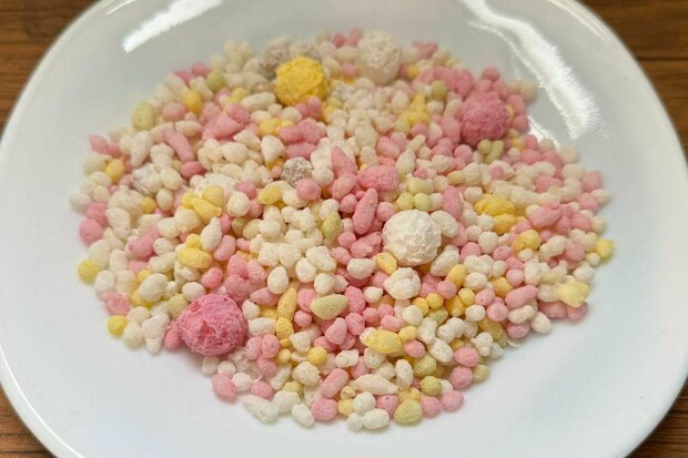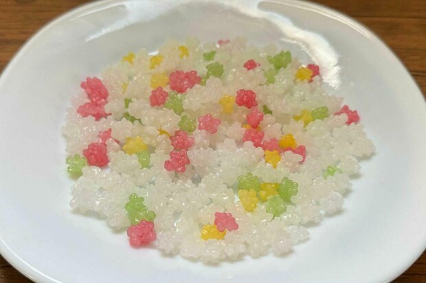 袋を開けてお皿に出してみると、白をベースにピンク、緑、黄色のカラフルな金平糖がたっぷり散りばめられており、まるで春の花畑のような可愛らしさです。