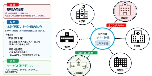 同社では、学校や病院、保育園、福祉施設と様々な場所で食事を提供しているが、各現場でギリギリの人数で運営していると、たった一人の欠勤で現場が崩壊するリスクがあることから、本社所属のフリー社員を拡充した。
