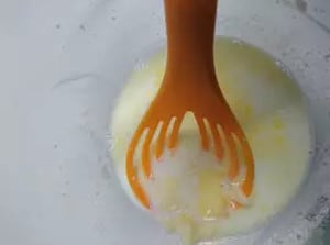 牛乳にチーズを溶かす牛乳を温めておきベビーチーズを溶かします。スライスチーズでもOKです。