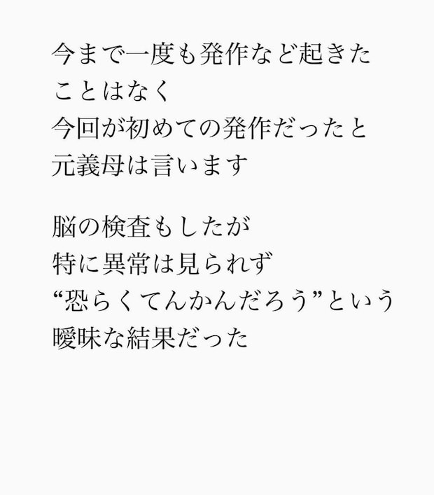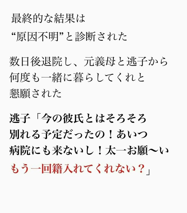 無事に離婚が成立し、3年ほどたったある日、元妻の母から電話がかかってきます。どうやら逃子は職場で倒れ、救急搬送されたようです。