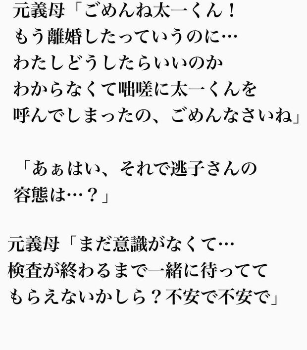 娘が倒れ、パニックになった逃子の母…。思わず元夫である、太一さんへ電話をかけてしまったようです。
