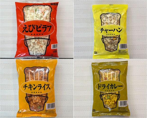 今回は、1kgの大容量から1食分の食べ切りサイズまで用途に合わせて使い分けできる、冷凍チャーハン、えびピラフ、チキンライス、ドライカレーの4種類をご紹介します!