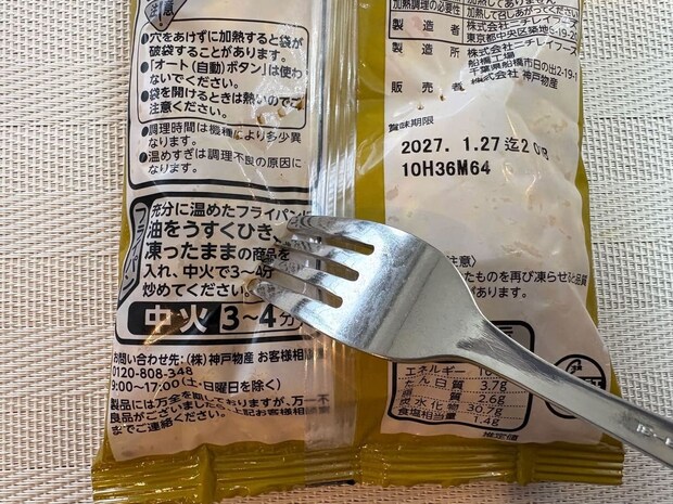 電子レンジ調理の場合、皿に移す必要はなく、袋に直接フォークで数カ所穴をあけて、電子レンジで加熱できるんです!