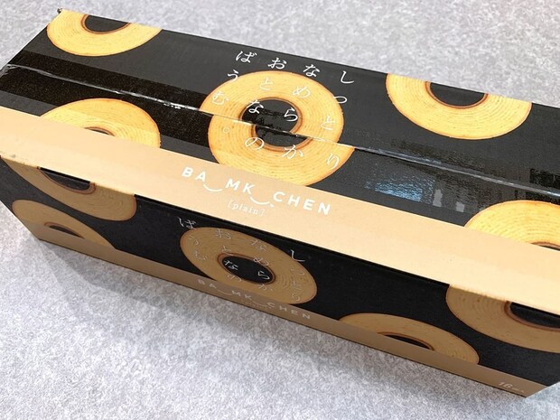 黒を基調とした高級感あふれるパッケージを開けると、美しい年輪模様のバウムクーヘンが16個も入っています。1個あたり約90円という驚きのコスパ!