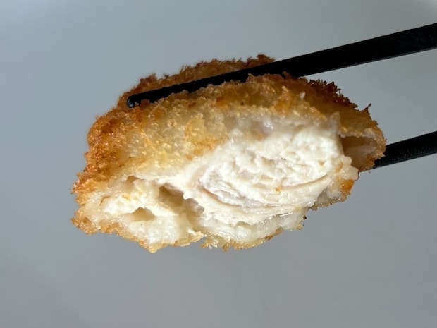 調理は凍ったまま揚げるだけで完了します。細かい生パン粉の衣はサクサクとしており、鶏むね肉を使用していながらパサつきがなくしっとりとした仕上がりです。