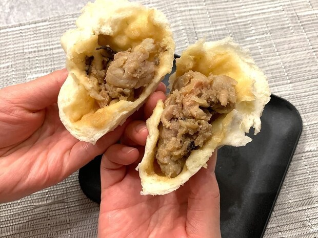 実食すると、皮はふかふかで、中の餡はオイスターソースや醤油が効いた濃いめの味付けです。低価格ながらお肉がたっぷりと入っており、噛むほどに旨味が広がります。